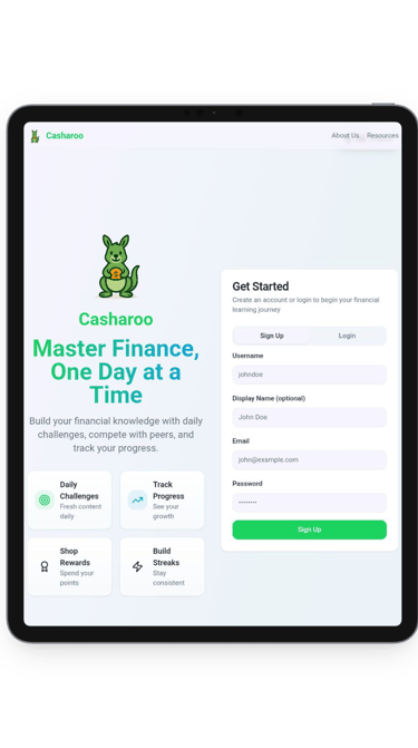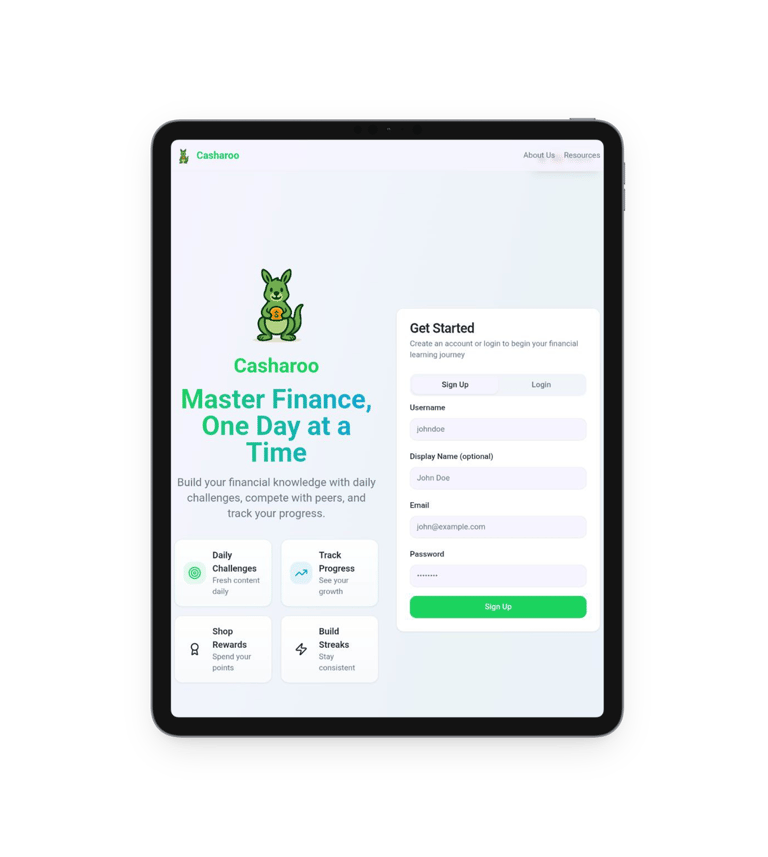 Casharoo is a gamified financial-literacy platform designed to make core financial concepts interactive, measurable, and accessible to students. I co-founded Casharoo to move financial education beyond static instruction and into systems students actively engage with.